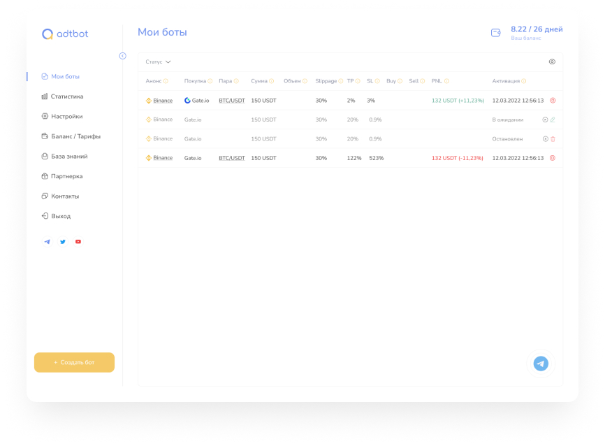 Фармил крипту на торговых ботах, но злился на них из-за интерфейса. Но нашёл в телеграмме ADTBot и цена не большая. Купил и глаз ненарадуется